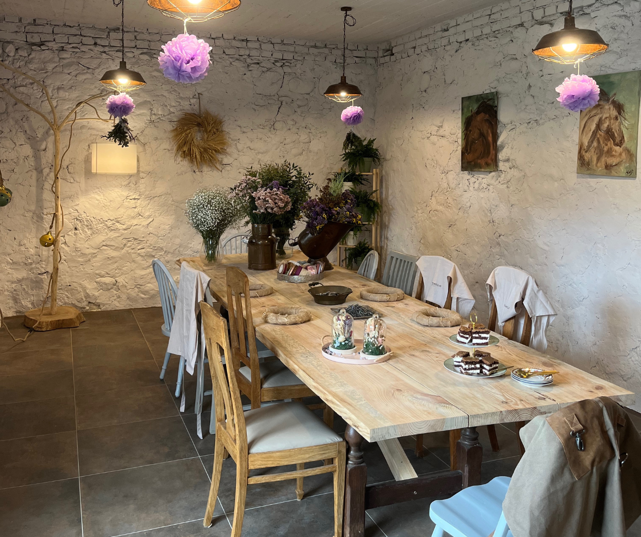 Do dyspozycji uczestników warsztatów jest przestronna sala warsztatowa, łazienka, aneks kuchenny, kącik z kanapą, parking oraz strefa relaksu, w której mieszkają oswojone kózki oraz owieczki.
